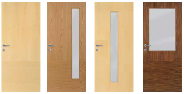 Üveghely-kivágású fafurnér ajtók változatos formáiból szintén keressünk a katalógusból, mert a belső teret világosabbá varázsolja, az akár teljes víztiszta üveg, akár az áttetsző mart felületet választja. Szitanyomással további motívumok, minták felvihetők. A teljes üvegajtók kizárólag ESG biztonsági üvegből készülnek.